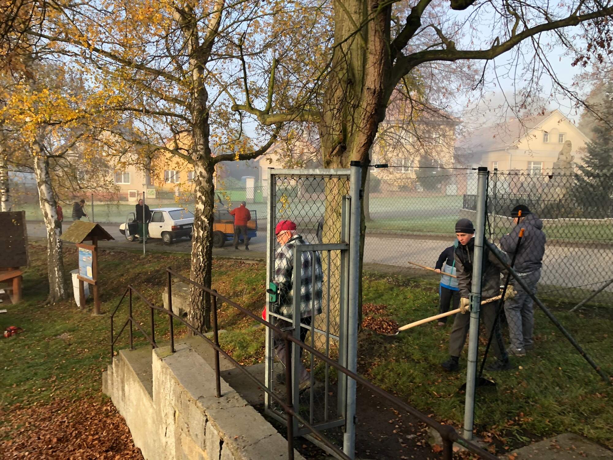 - shrabání listí na dětském hřišti, kolem pomníku