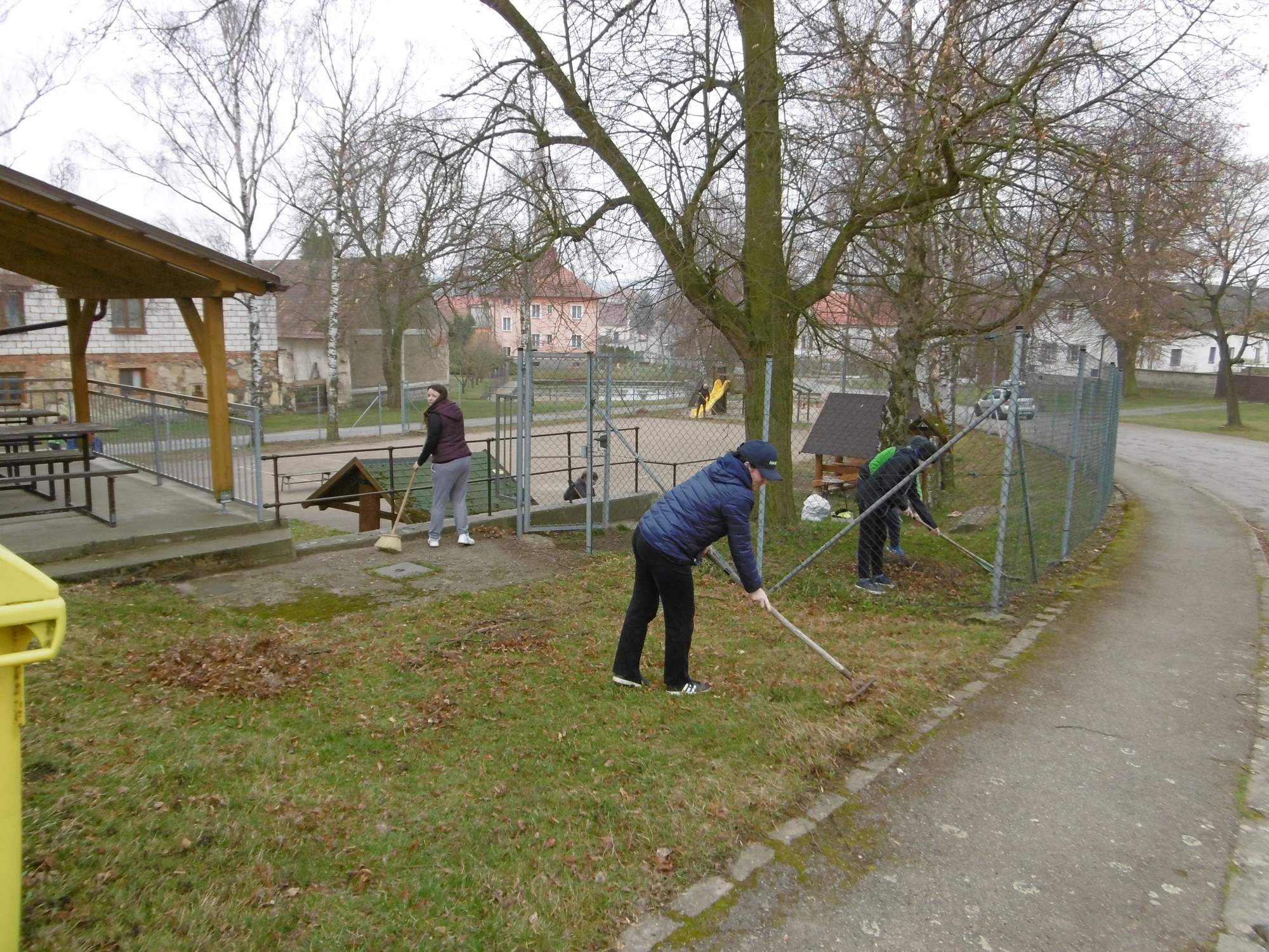 Proběhlo rozdělení na menší skupinky a společně tyto skupiny zvelebily okolí místní hospody, obecního úřadu a pomníku padlých. Samozřejmě nechyběl úklid dětského hřiště, dále byly upraveny chodníky a jejich okolí v této části obce. Chlapi porazili dvě nebezpečné břízy, jednu na dětském hřišti a jednu u pomníku padlých.