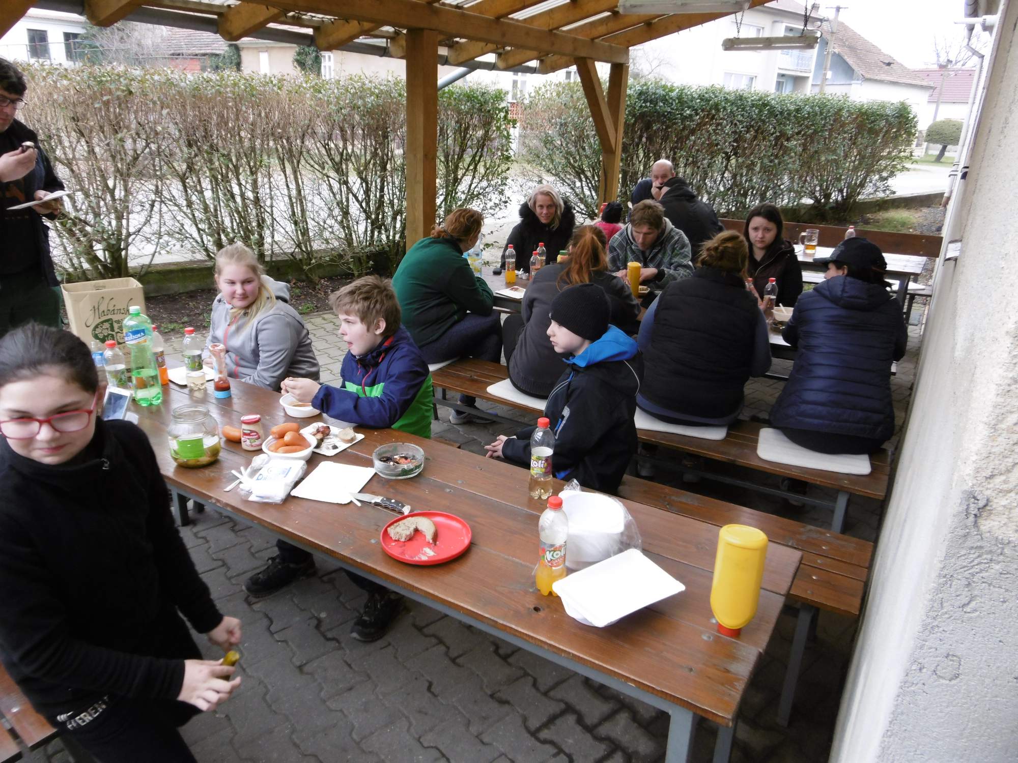 Posléze se všichni brigádníci stáhli ke skupině pracující na ořezu lip u koupaliště, aby pomohli s úklidem větviček, dřeva a listí. Po velké dřině se všichni odebrali k místní hospodě, kde se občerstvili vuřty a výbornou gulášovou polévkou.